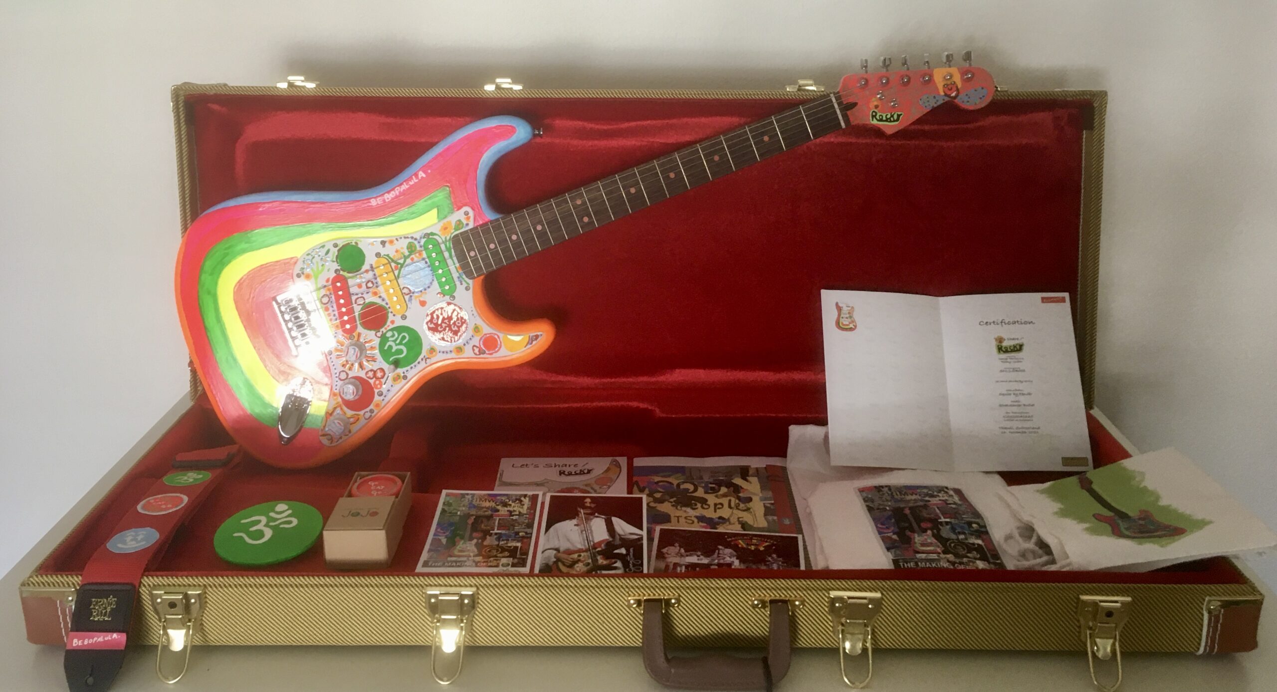 Die Idee, die Gitarren zu verkaufen, war von Anfang an vorhanden, denn ich fand, da Fender sein Modell zu einem Preis ($ 25’000.00) anbot, dieser für Normaldienende nicht bezahlbar ist und das trifft sicher auf den Grossteil von Beatles resp. George Harrison Fans zu. So erstellte ich die Exemplare im Sinne von „Jeder sollte eine ROCKY haben“ und unter dem Motto „Let’s Share / ROCKY“. Die Bemalung ist übrigens sehr originalgetreu, sowohl was die Exaktheit als auch die Farben betrifft und sie hält mit der Fender durchaus mit.